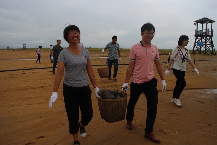 風(fēng)雨停歇之時(shí),第一、二黨支部全體黨員捋起袖子,提起垃圾筐,在黃金浴場(chǎng)上進(jìn)行“拉網(wǎng)式”清撿垃圾活動(dòng)?;顒?dòng)中,大家分工協(xié)作,團(tuán)結(jié)互助,忙得不亦樂乎,現(xiàn)場(chǎng)一片熱火朝天的景象。沙灘上的垃圾大多為煙蒂、石頭、礦泉水瓶等,考慮群眾在沙灘上大都赤腳走路,為了群眾的安全,黨員們將沙灘上的貝殼也都一并清撿,清除貝類劃傷的風(fēng)險(xiǎn)。其中一位老黨員向大家說到:“大家一定不要覺得清潔活動(dòng)就只是單純地?fù)炖?,我們撿的可都?lsquo;黃金’啊,別看小小一個(gè)煙蒂,我們把它撿起來了,環(huán)境就美了,群眾就會(huì)更加自覺了,那么誰也不舍得扔下手中的這枚‘黃金’了。所以,我們黨員今天的清潔行動(dòng)不僅是推行群眾文明出行的理念,更是引導(dǎo)群眾自覺保護(hù)環(huán)境,關(guān)愛自然,從而讓清潔、環(huán)保成為每個(gè)人的責(zé)任。”老黨員看似平淡的話語,卻是對(duì)我們的諄諄教導(dǎo),進(jìn)一步激發(fā)了我們身為一名共產(chǎn)黨員的責(zé)任感和使命感,同時(shí)也讓我們深刻認(rèn)識(shí)到生態(tài)環(huán)境建設(shè)和保護(hù)迫在眉睫。