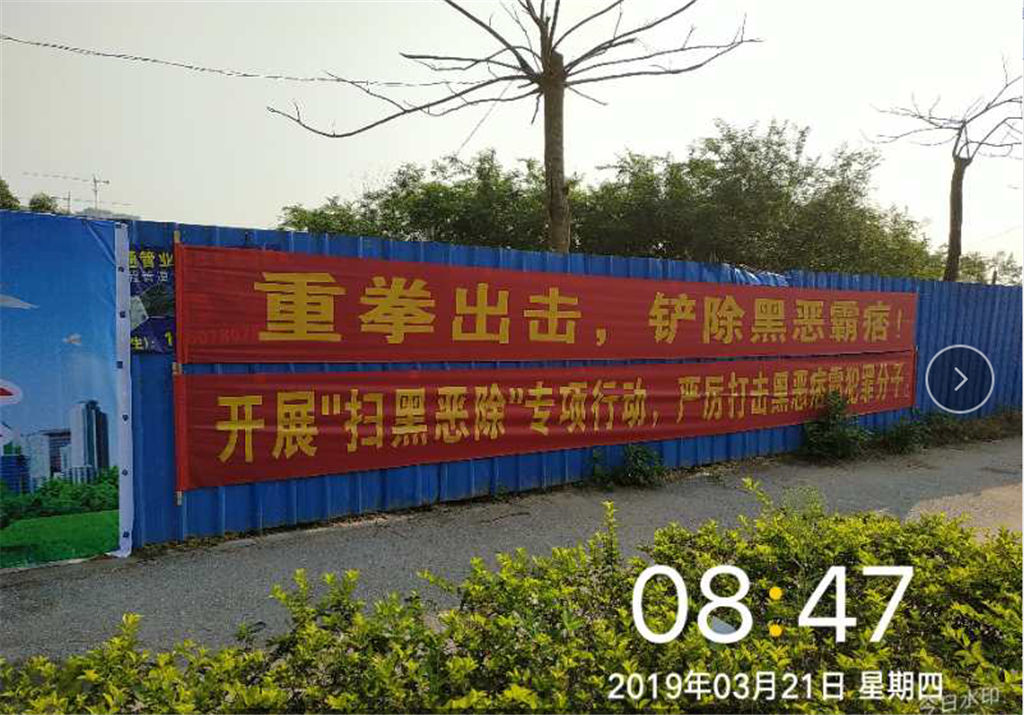 為抓好此項(xiàng)工作,通知各項(xiàng)目代表深入現(xiàn)場,并召集施工單位召開了專題動員會,并制定了具體的工作措施,如:張掛橫幅、微信群、qq群等渠道宣傳掃黑除惡行動。做到每個項(xiàng)目現(xiàn)場都在明顯位置張掛掃黑除惡標(biāo)語的橫幅。
