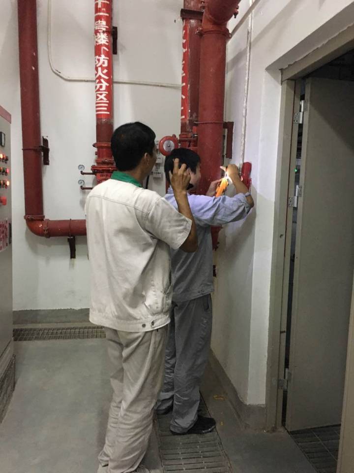 圖為消防維保單位及物業(yè)工程人員在進行現(xiàn)場消防設(shè)施檢查