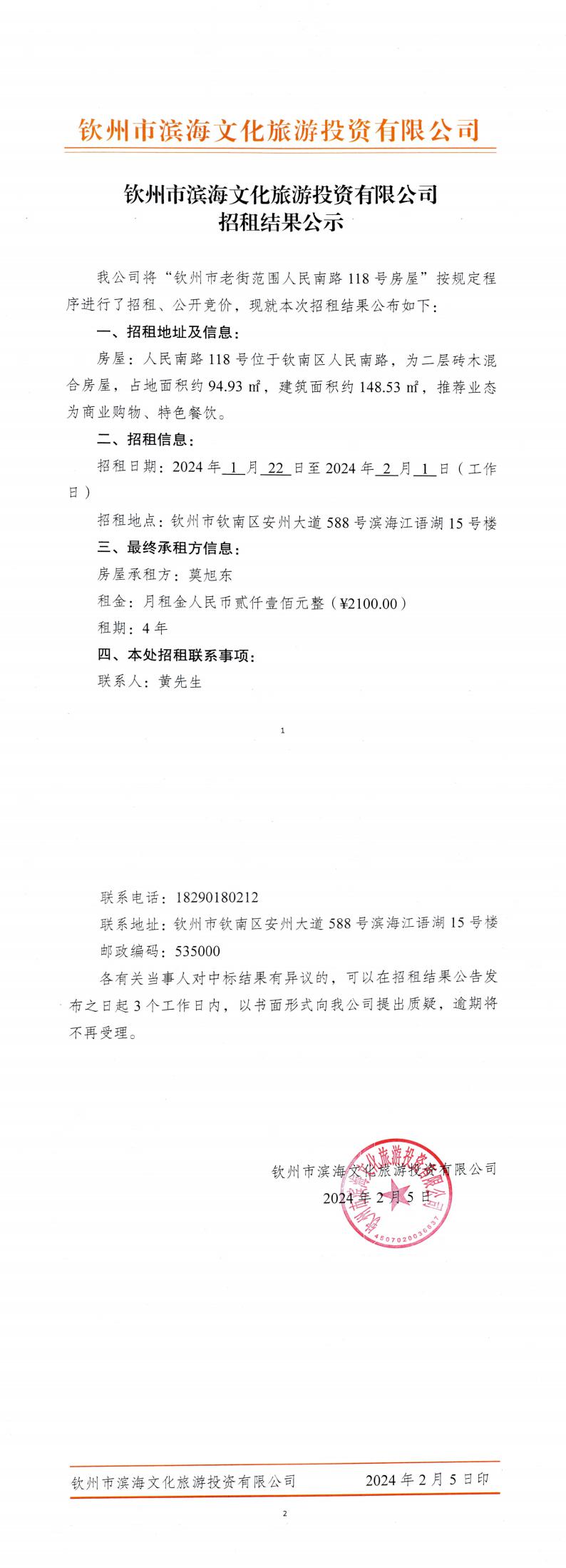 關(guān)于欽州市濱海新城投資集團(tuán)有限公司綜合展示廳成交結(jié)果公告