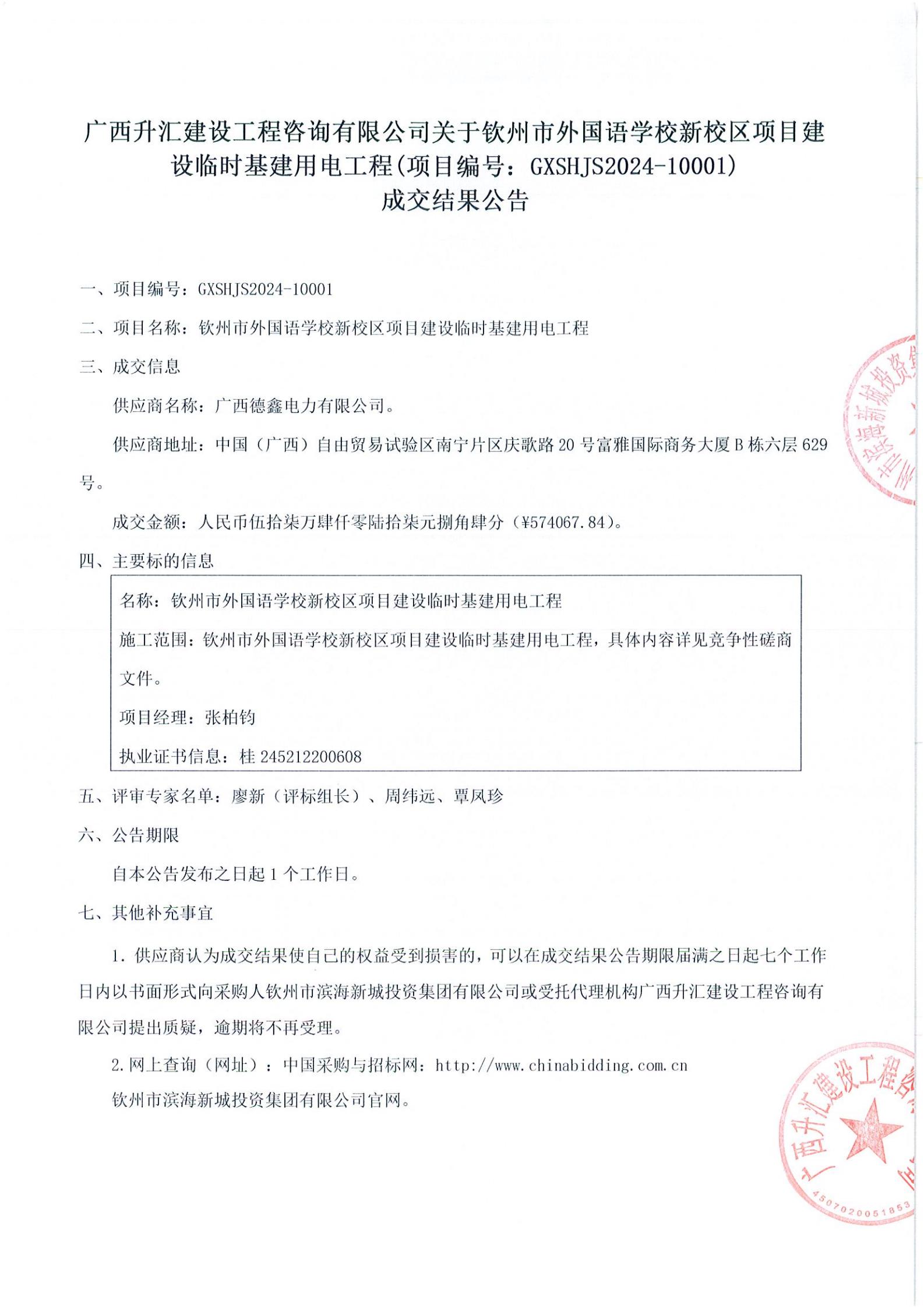 欽州市外國(guó)語(yǔ)學(xué)校新校區(qū)項(xiàng)目建設(shè)臨時(shí)基建用電工程成交結(jié)果公告
