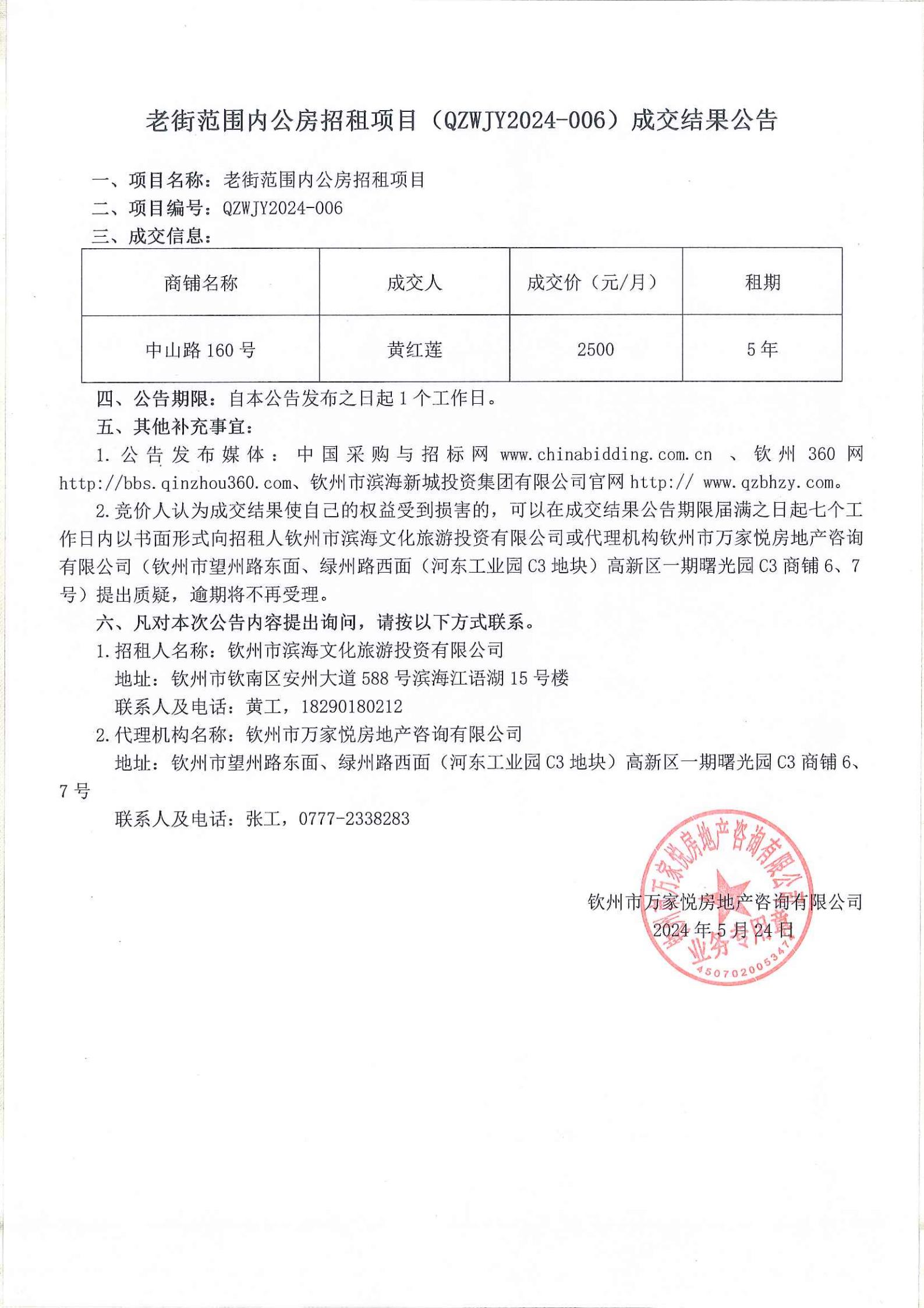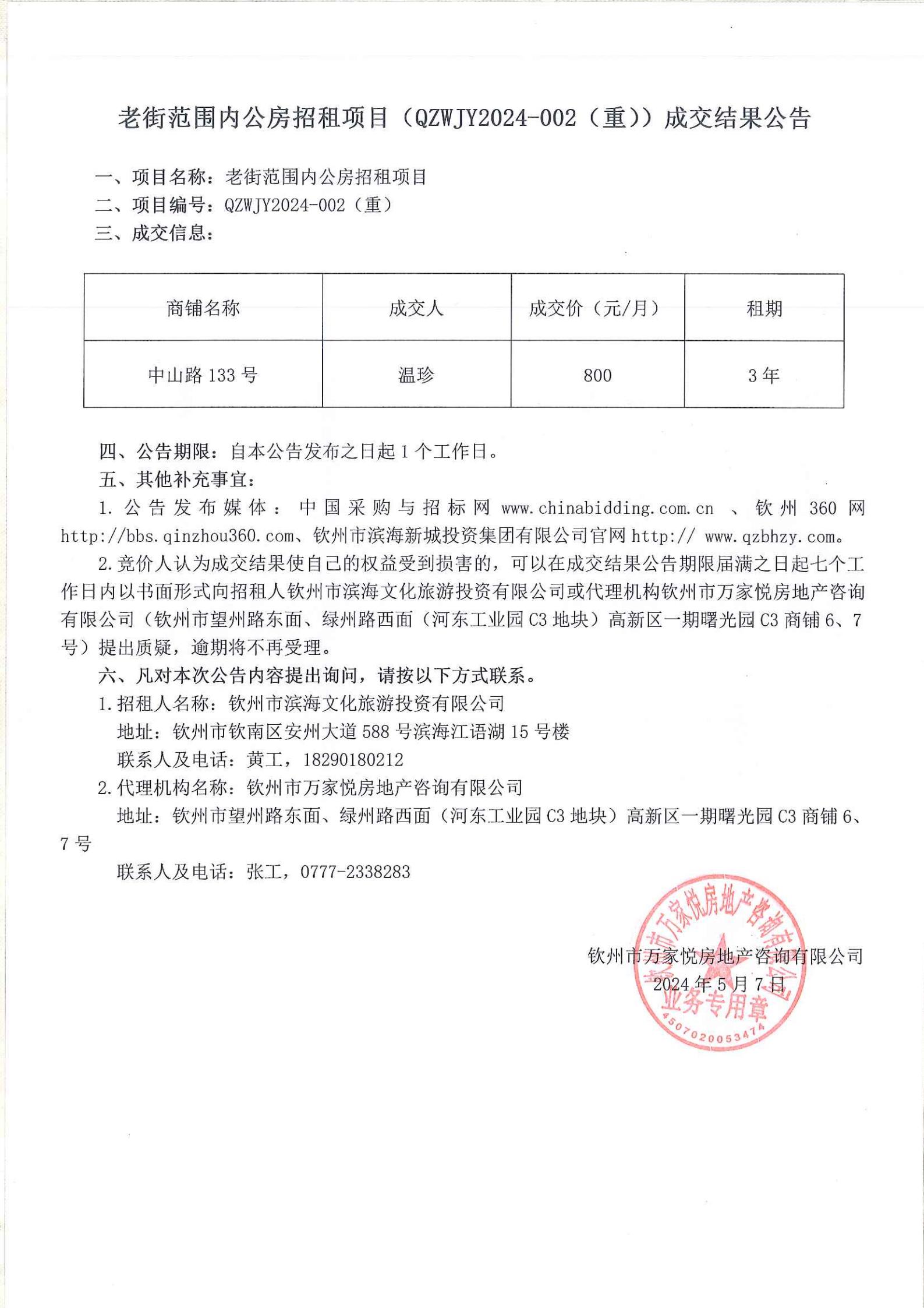 老街范圍內(nèi)公房招租項(xiàng)目(QZKR2024-006)成交結(jié)果公告