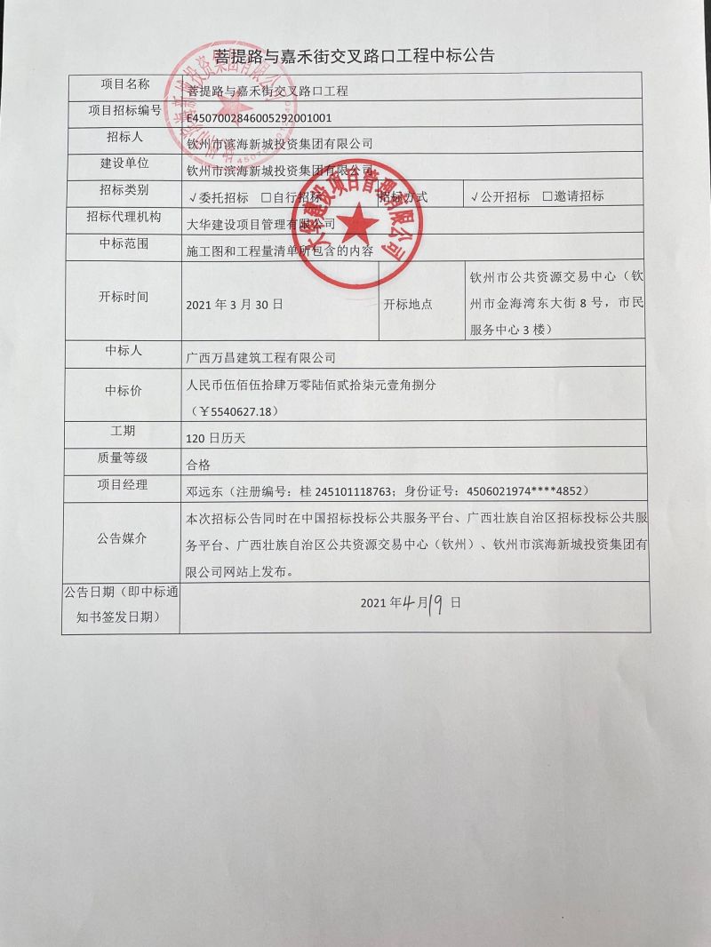 菩提路與嘉禾街交叉路口工程中標候選人公示