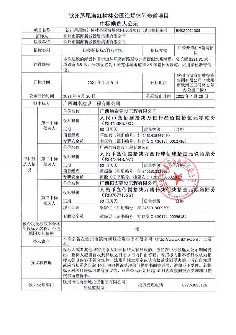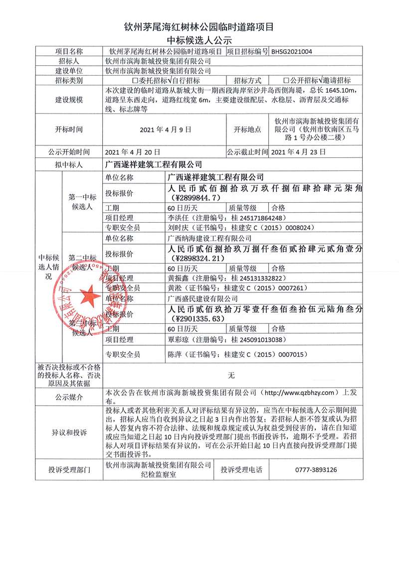 欽州茅尾海紅樹林公園臨時道路項目候選人公示