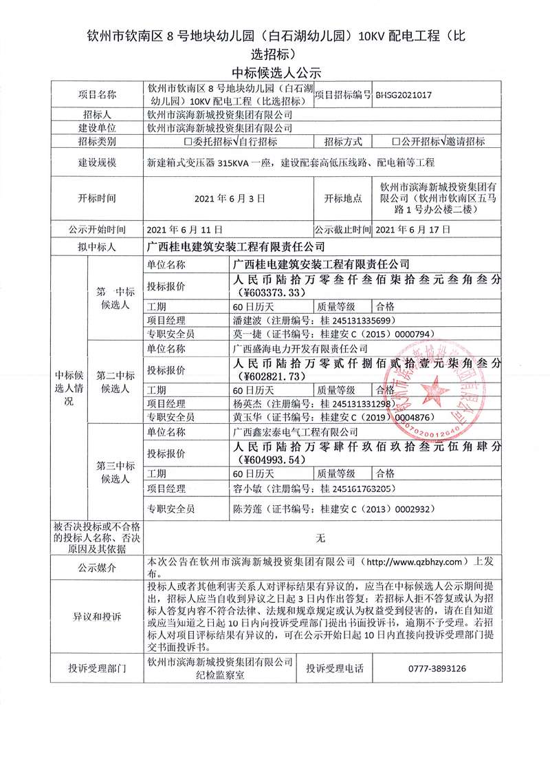 欽州市欽南區(qū)8號地塊幼兒園(白石湖幼兒園)10KV配電工程中標公示