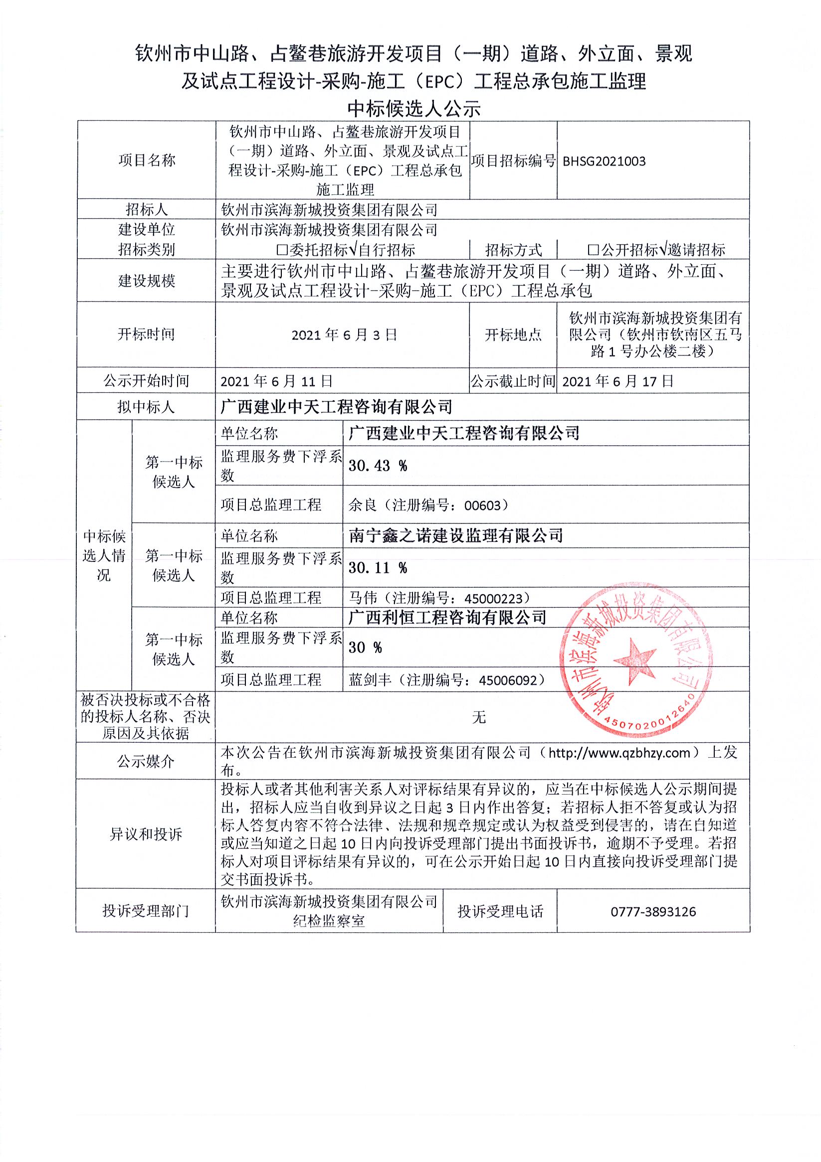 欽州市中山路、占鰲巷旅游開發(fā)項目(一期)道路、外立面、景觀及試點工程設(shè)計-采購-施工總承包監(jiān)理中標公示