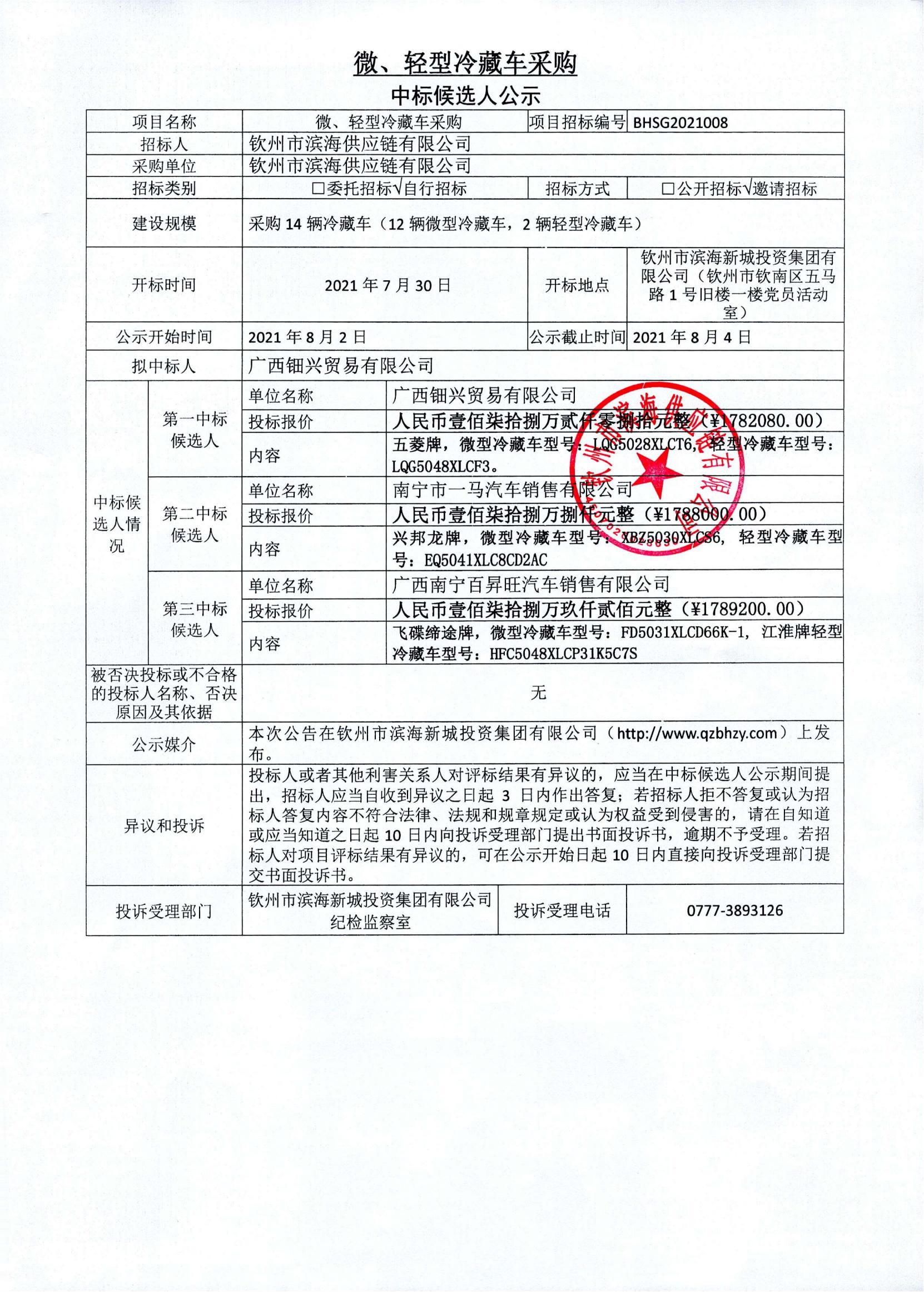 微、輕型冷藏車采購中標候選人公示