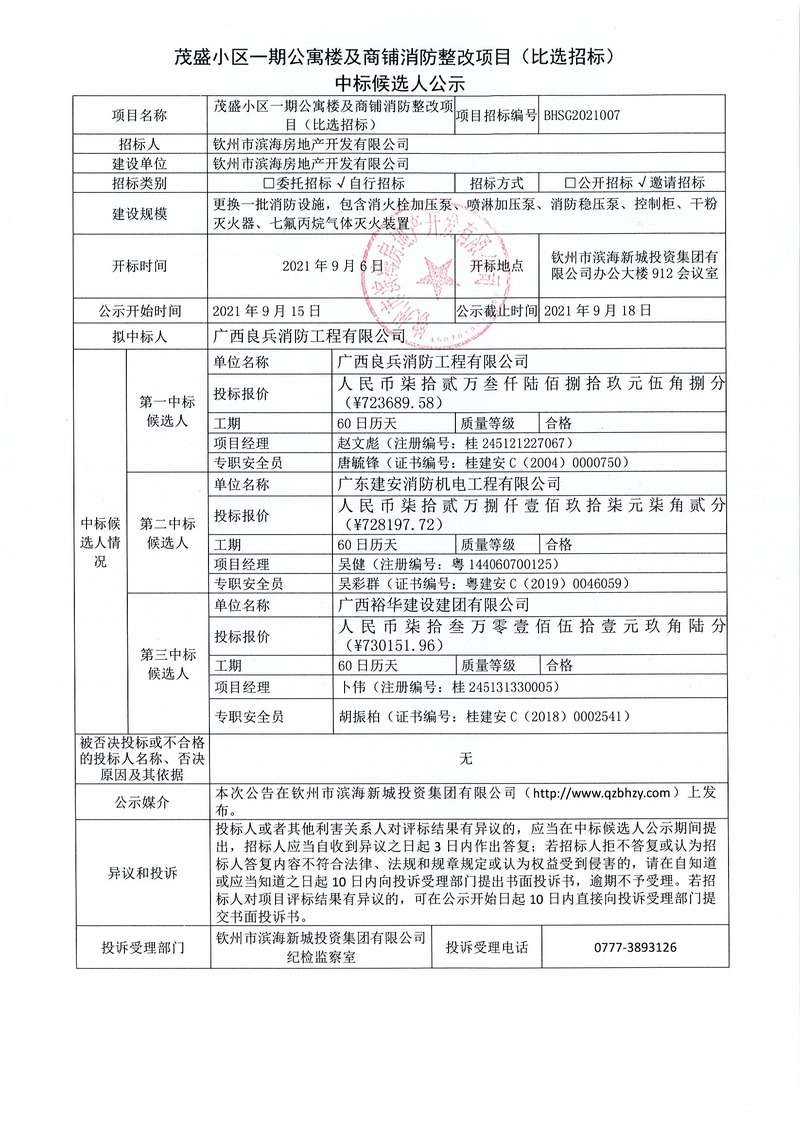茂盛小區(qū)一期公寓樓及商鋪消防整改項目(比選招標)中標候選人公示