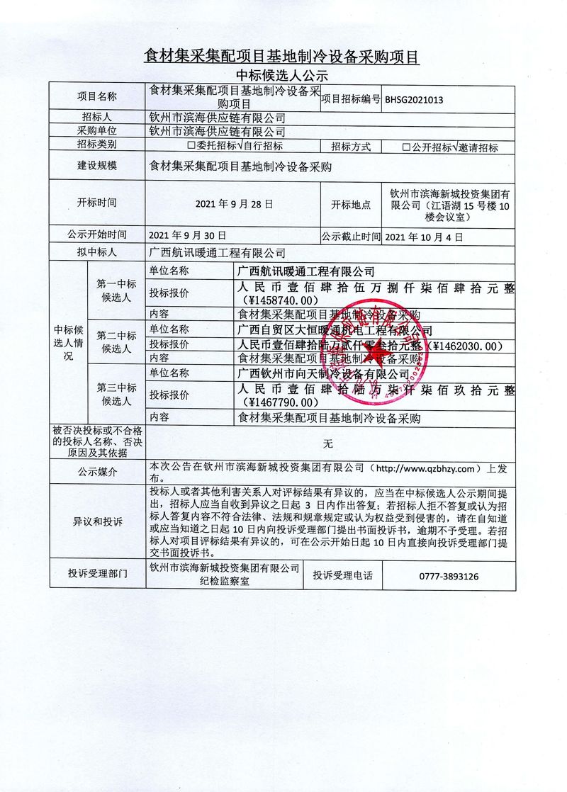 食材集采集配項目基地制冷設(shè)備采購項目中標候選人公示