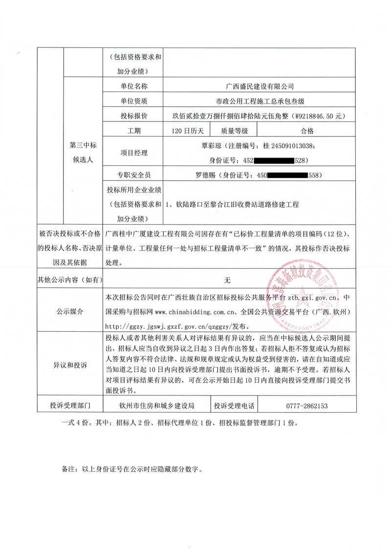 欽州市老舊城區(qū)改造提升項目中山路、占鰲巷道路改造及占鰲巷8號房屋加固修繕工程-中標候選人公示