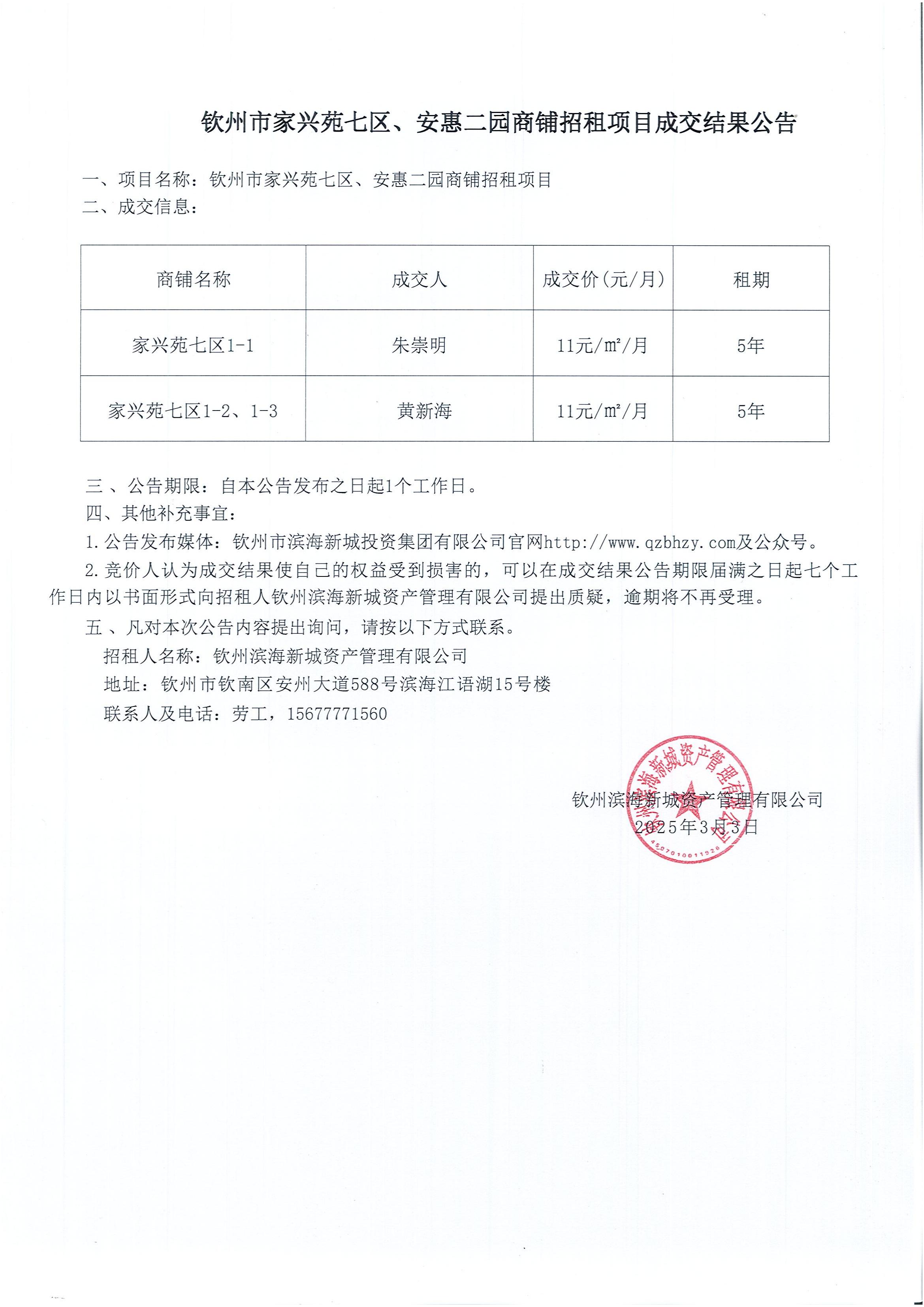 欽州市家興苑七區(qū)、安惠二園商鋪招租項(xiàng)目成交結(jié)果公告