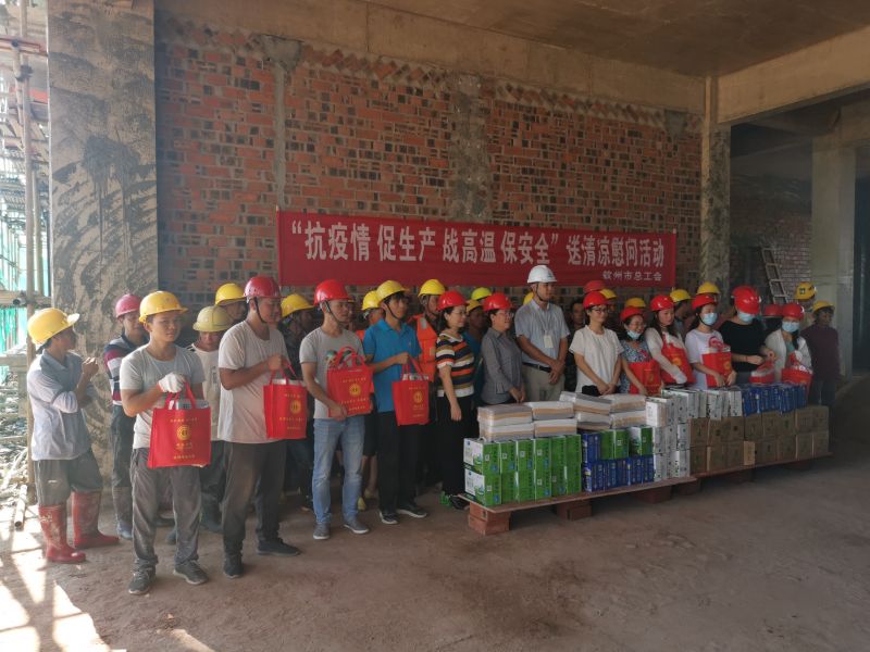 7月13日,欽州市總工會(huì)調(diào)研員黃春雯等一行到我集團(tuán)公司負(fù)責(zé)建設(shè)的欽州是茅尾海監(jiān)控監(jiān)測(cè)管理基地項(xiàng)目現(xiàn)場(chǎng),開展“抗疫情 促生產(chǎn) 戰(zhàn)高溫”送清涼慰問活動(dòng)。在炎炎夏日,為現(xiàn)場(chǎng)辛勤勞作的農(nóng)民工獻(xiàn)上一份清涼。致謝每一位在一線工作的人員,感謝他們?yōu)槲覀兂鞘邪l(fā)展貢獻(xiàn)一份力量。