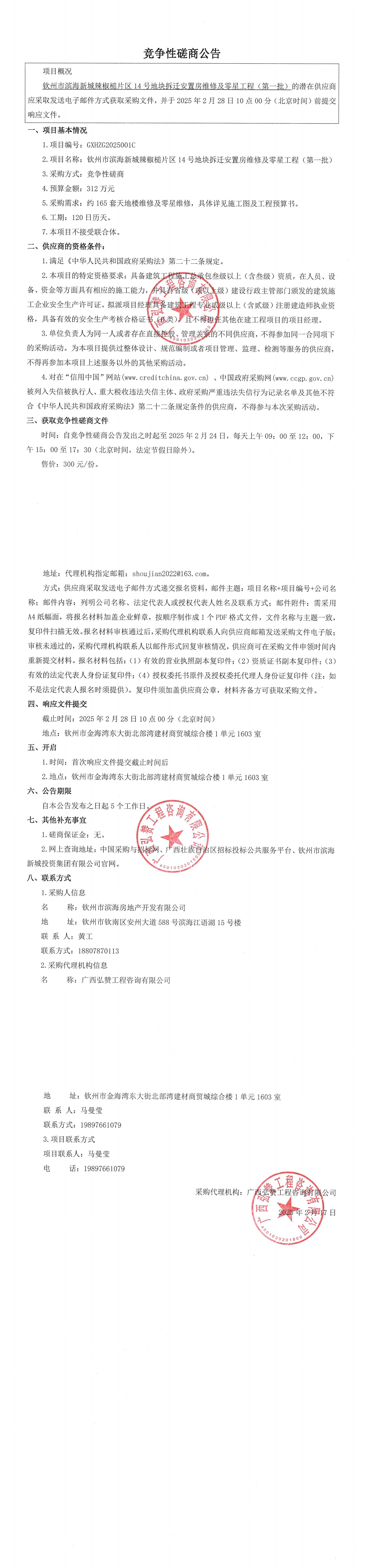 欽州市濱海新城辣椒槌片區(qū)14號(hào)地塊折遷安置房維修及零星工程(第一批)競(jìng)爭(zhēng)性磋商公告