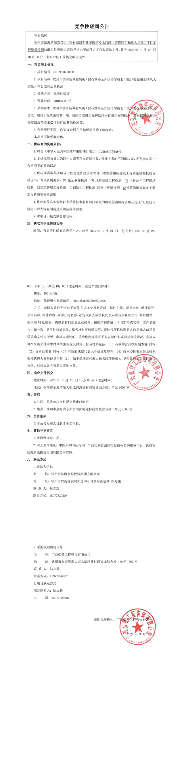 競(jìng)爭(zhēng)性磋商公告-欽州市濱海新城嘉興街(白石湖路至外國(guó)語(yǔ)學(xué)校北門段)(菩提路至揚(yáng)帆大道段)項(xiàng)自工程質(zhì)量檢測(cè)