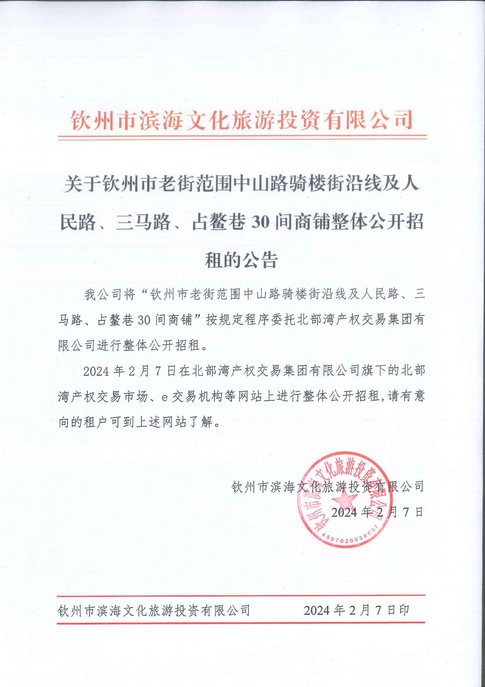關(guān)于欽州市老街范圍中山路騎樓街沿線及人民路、三馬路、占鰲巷30間商鋪整體公開招租的公告