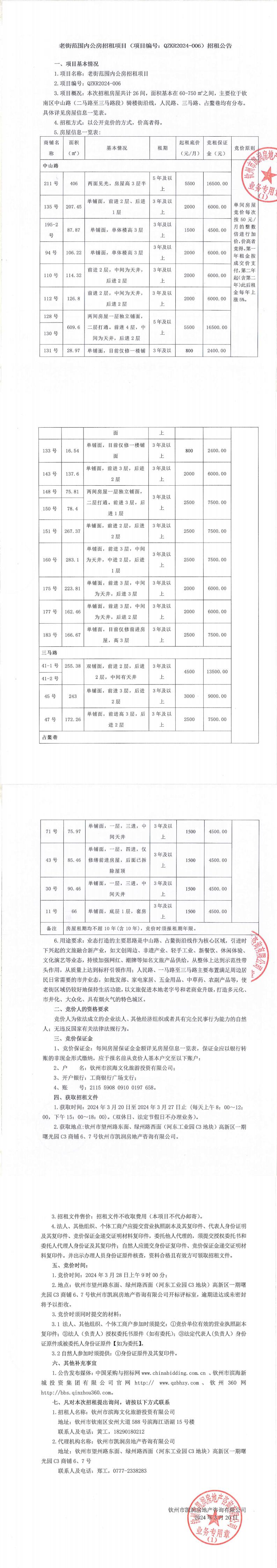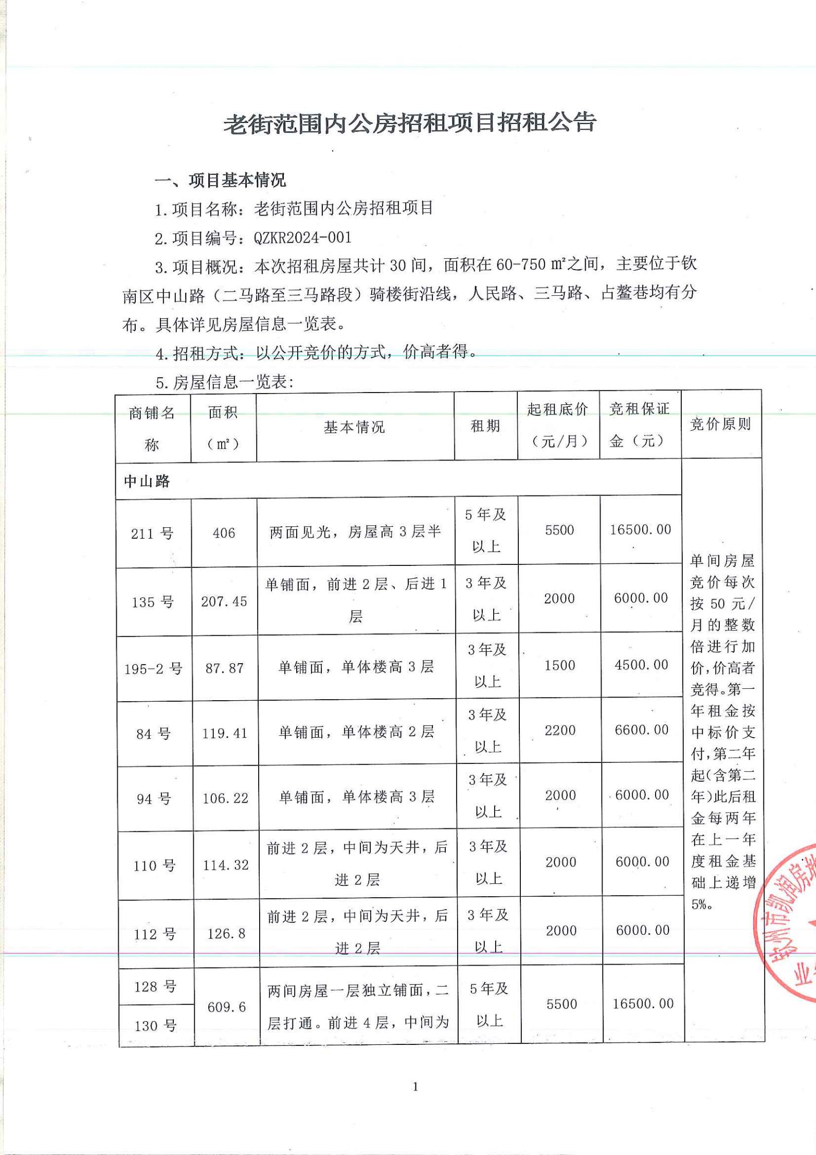 關(guān)于欽州市老街范圍人民南路82號、中山路120號6樓等三處房屋公開招租的公告