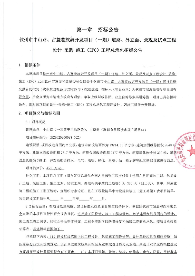 欽州市中山路、占鰲巷旅游開發(fā)項(xiàng)目(一期)道路、外立面、景觀及試點(diǎn)工程設(shè)計(jì)-采購(gòu)-施工(EPC)工程總承包招標(biāo)公告
